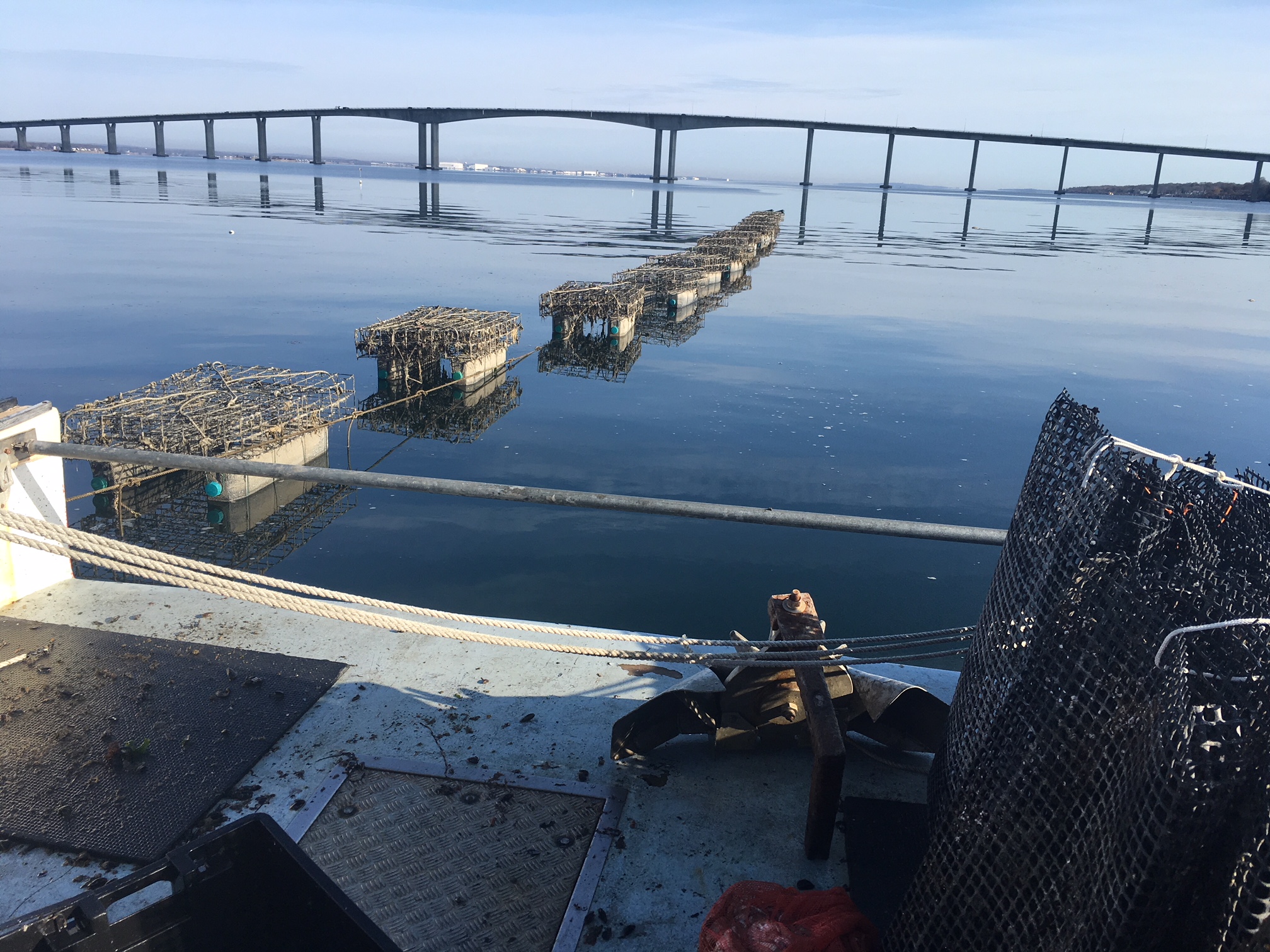 Venus oysters are raised in floating cages in Point Judith Salt Pond, Narragansett. The tides pull cold Block Island Sound…