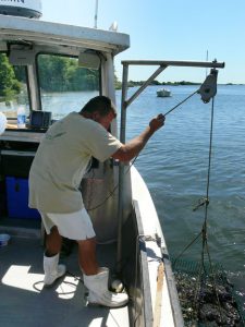 Rob now owns and operates a solar-powered oyster nursery on Ninigret pond which he shares with fellow pond farmers. The nursery raft is originally part of the oldest oyster farm in the states, established in 1977. Once oyster seeds reach 2mm, they are moved to the upweller system to accelerate their growth. Solar panels on the raft’s south-facing side harness energy to power pumps which push pond water through troughs in the raft’s upweller system where very young oysters are held.